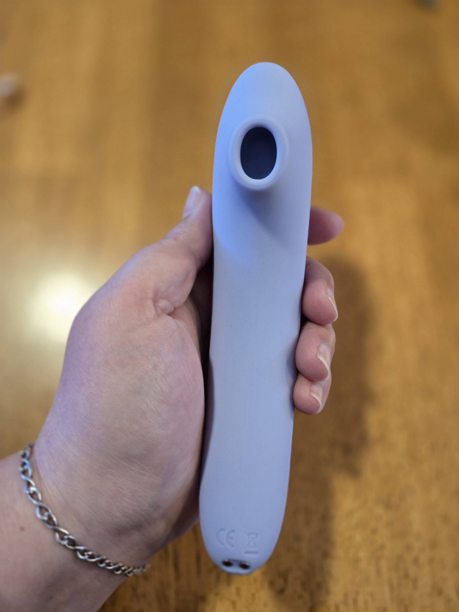 Rather than a pure suction toy, the Arc combines vibration with suction-driven pulsation. There’s a soft silicone membrane inside the nozzle, and air presumably moves that membrane in and out, creating suction. But the toy itself also vibrates. The combination is so intense that I can’t actually use the Arc. I tend to be really sensitive, and I usually use my toys on a lower setting. I couldn’t even situate this on my clit without intense discomfort. I gave this toy a hard “nope” instead.