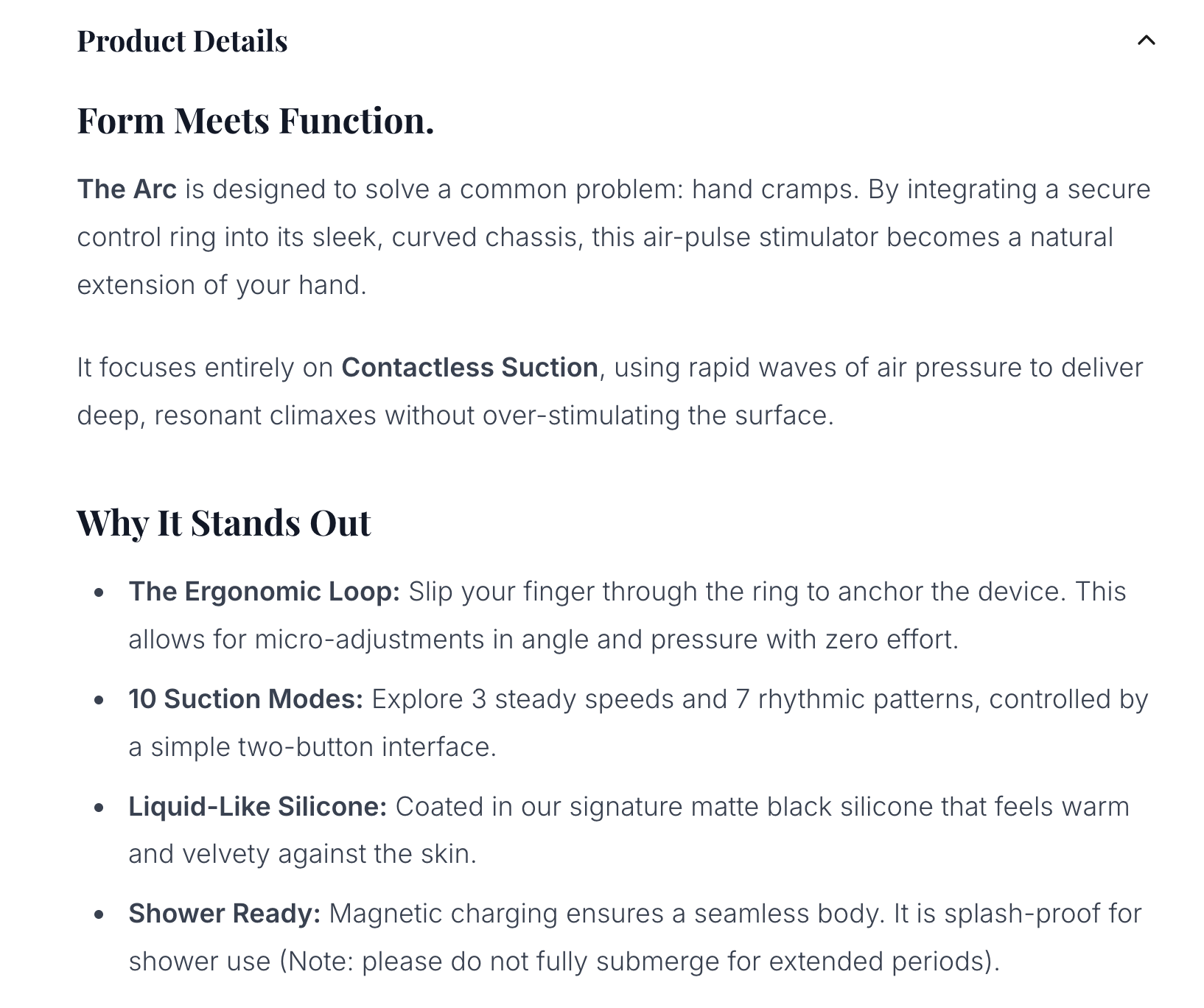 The Arc has other things going for it. The toy aesthetics are beautiful, and even the storage bag is lovely. (Nice to have one that’s not black satin.) It’s mostly waterproof, suitable for shower play. It’s indeed ergonomic and easy to hold, even if the mythical control ring is nowhere to be found. The design is nice…but it’s not for beginners.